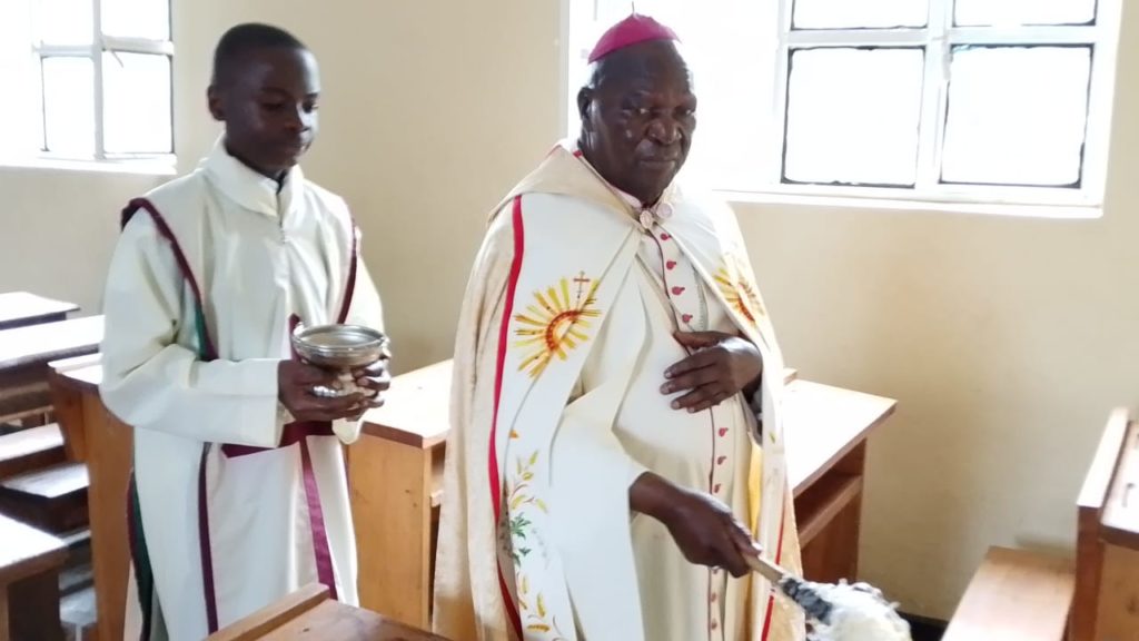 Mgr Faustin est venu au centre le mois dernier, vendredi 29/11/2024. Il a béni le chantier de 5 classes du primaire. Il entouré par les responsables : Simon, Bertin, Gaudence, Mugisho et Marie Claire. Père Boniface est au fond.
